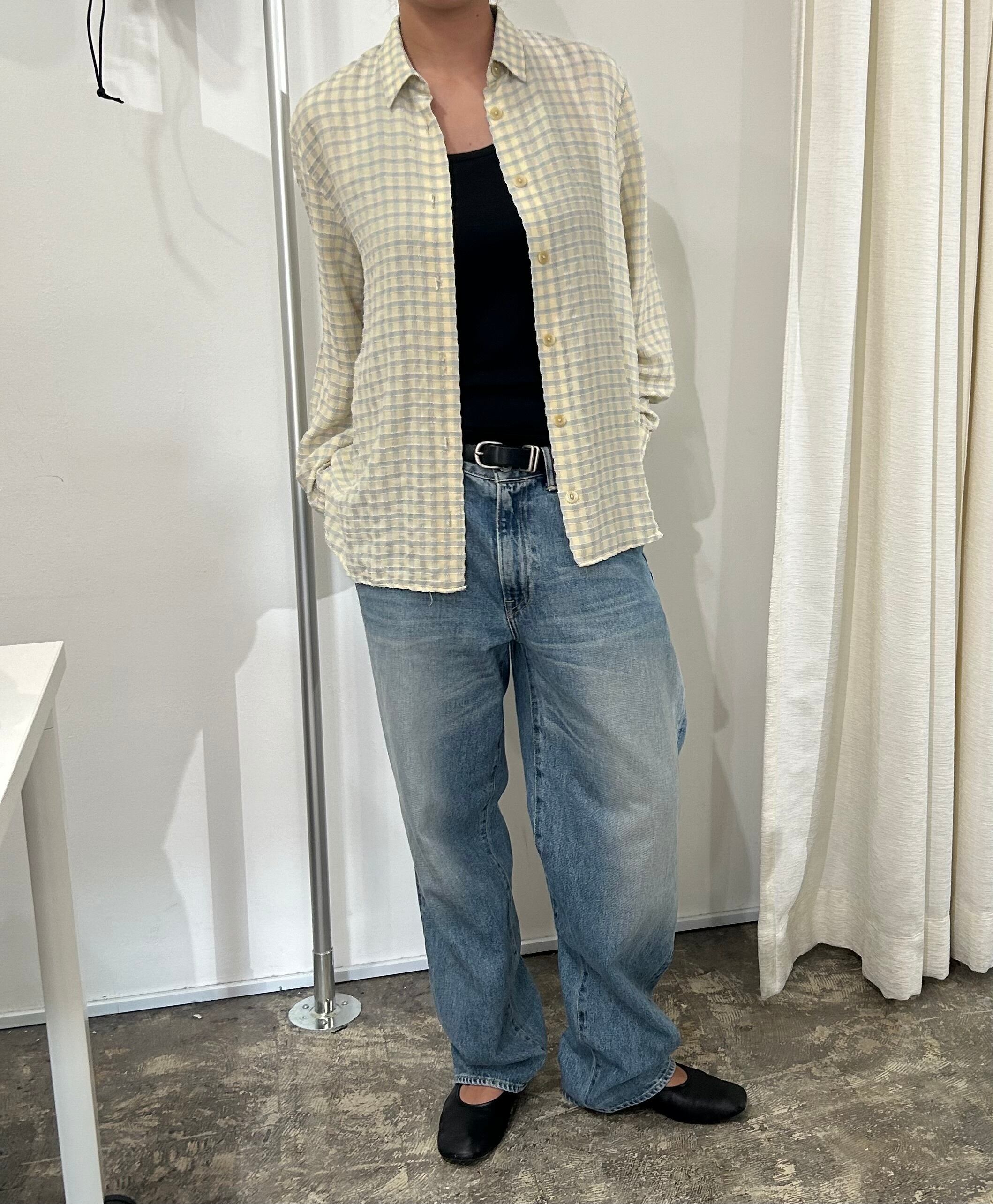 薄いイエローと水色のチェックの色合わせが絶妙で可愛いです。長袖なので羽織はもちろん、肩にかけても良さそうです。