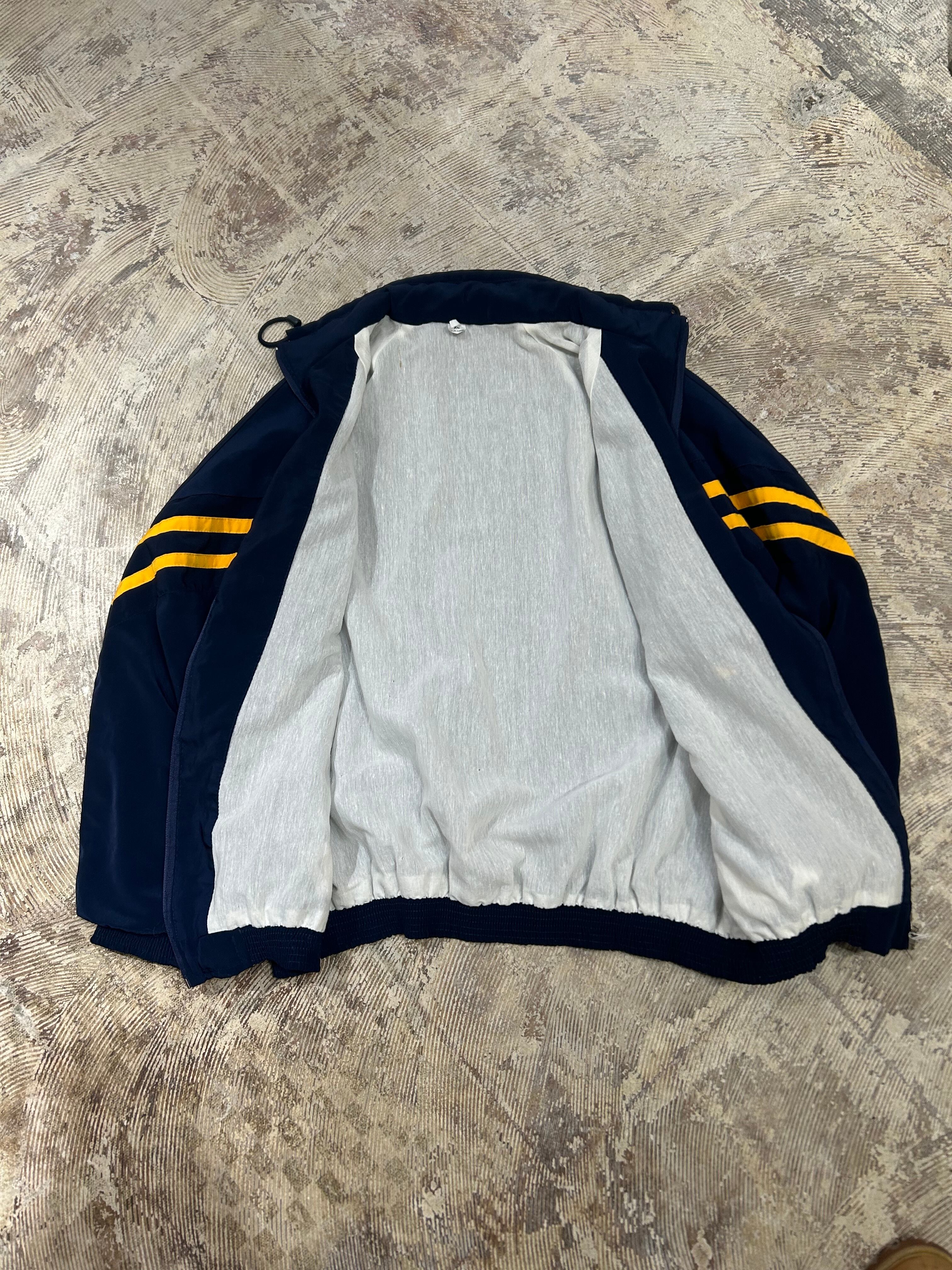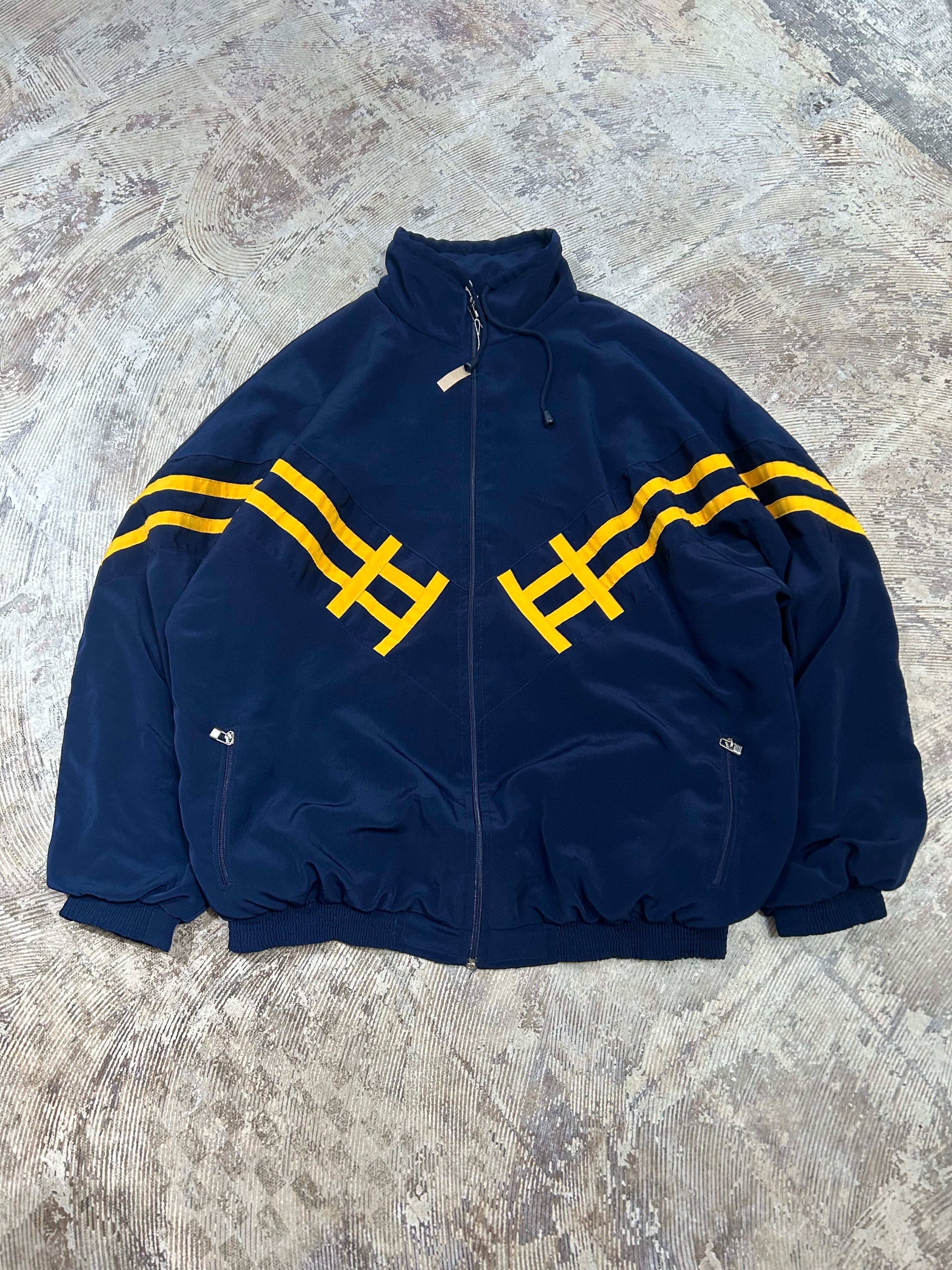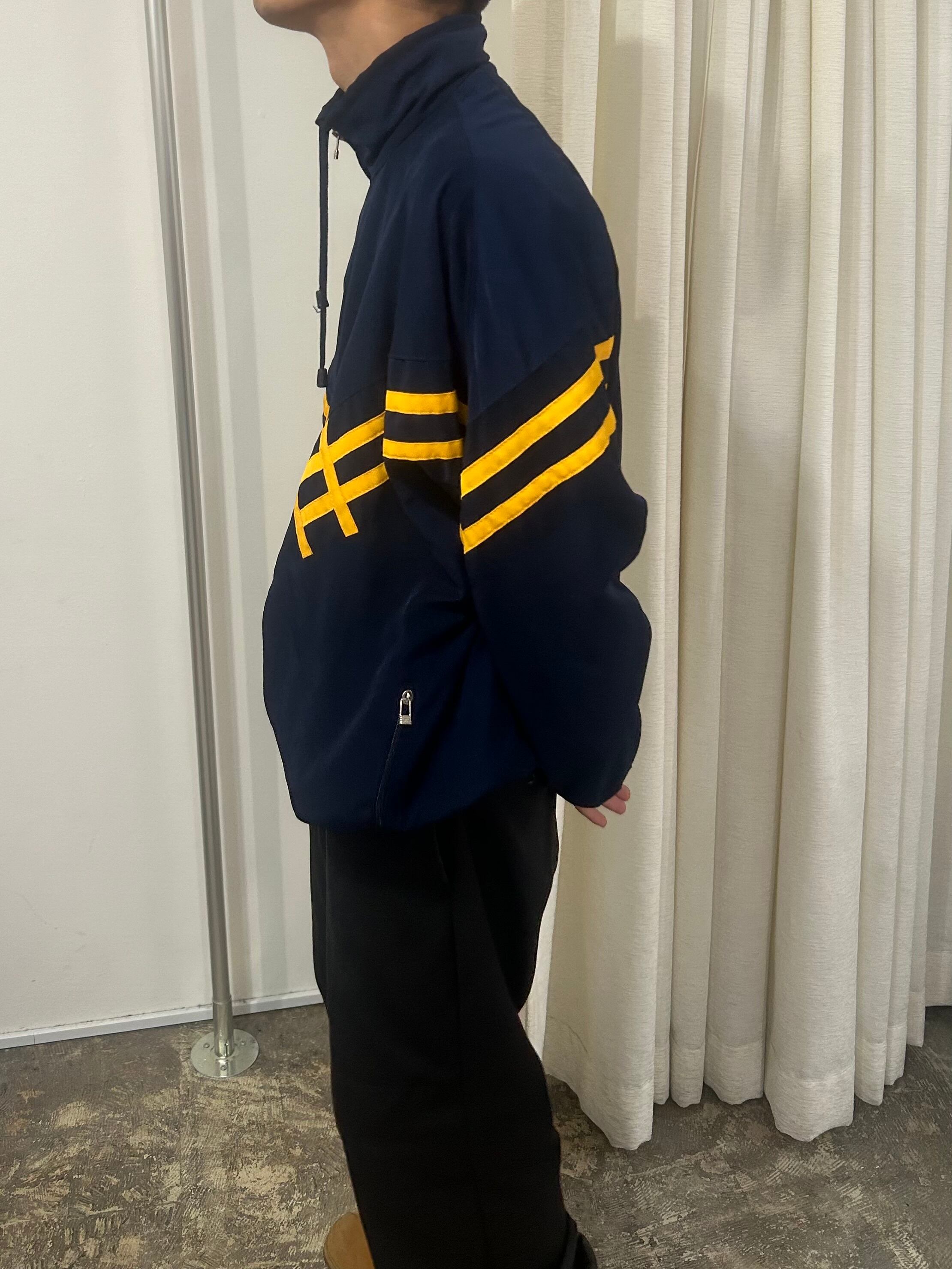 ネイビーにイエローラインの配色が映えるトラックジャケット。