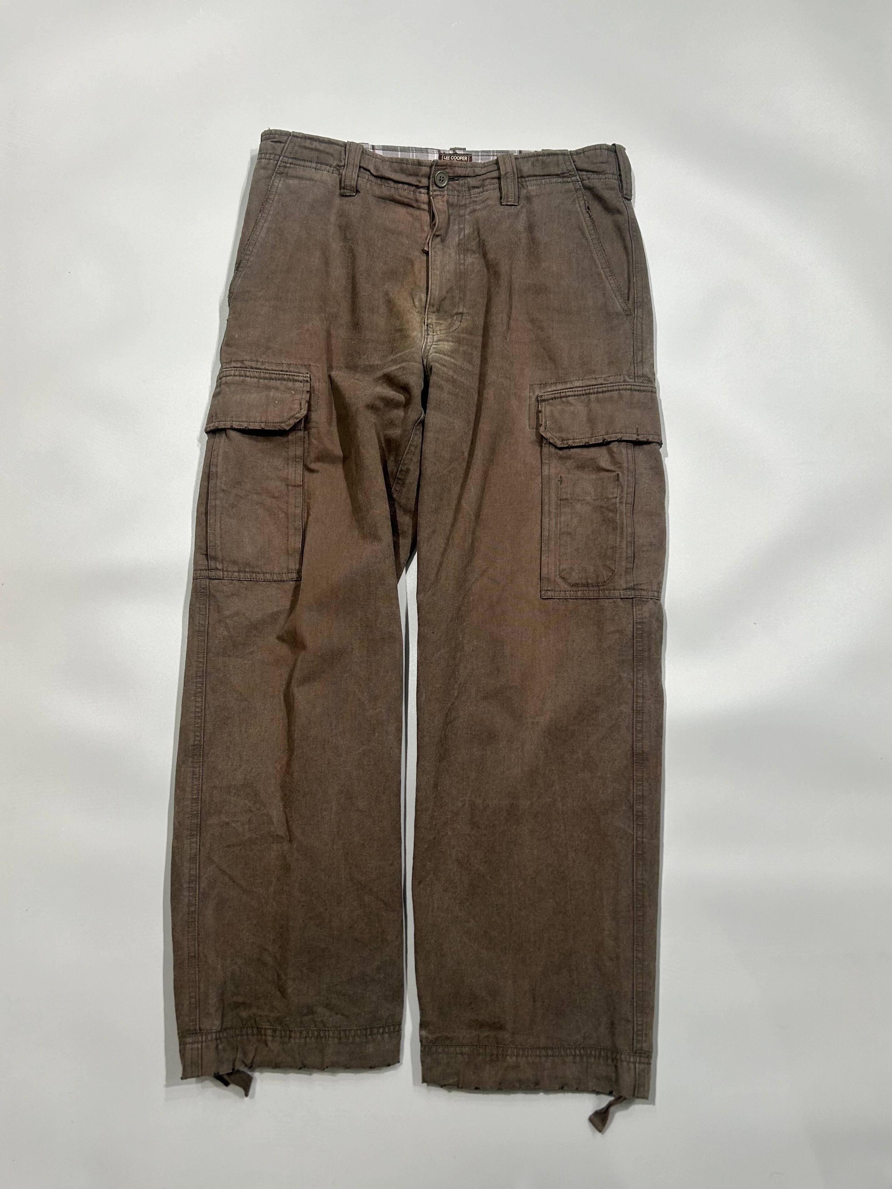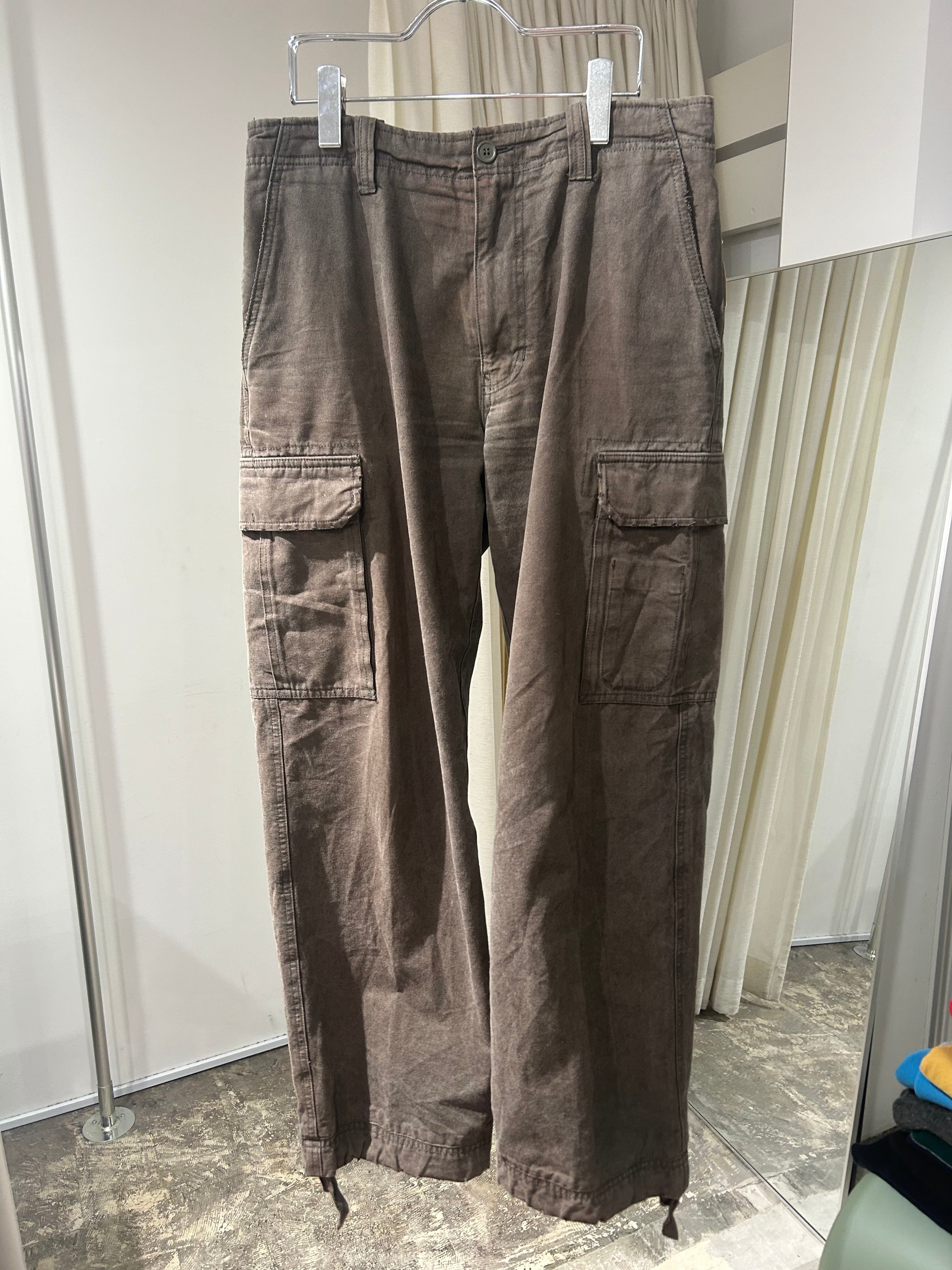 ダック生地のカーゴパンツ。生地は薄めなのが特徴です。カーハートやディッキーズにくらべ、楽にはけます。