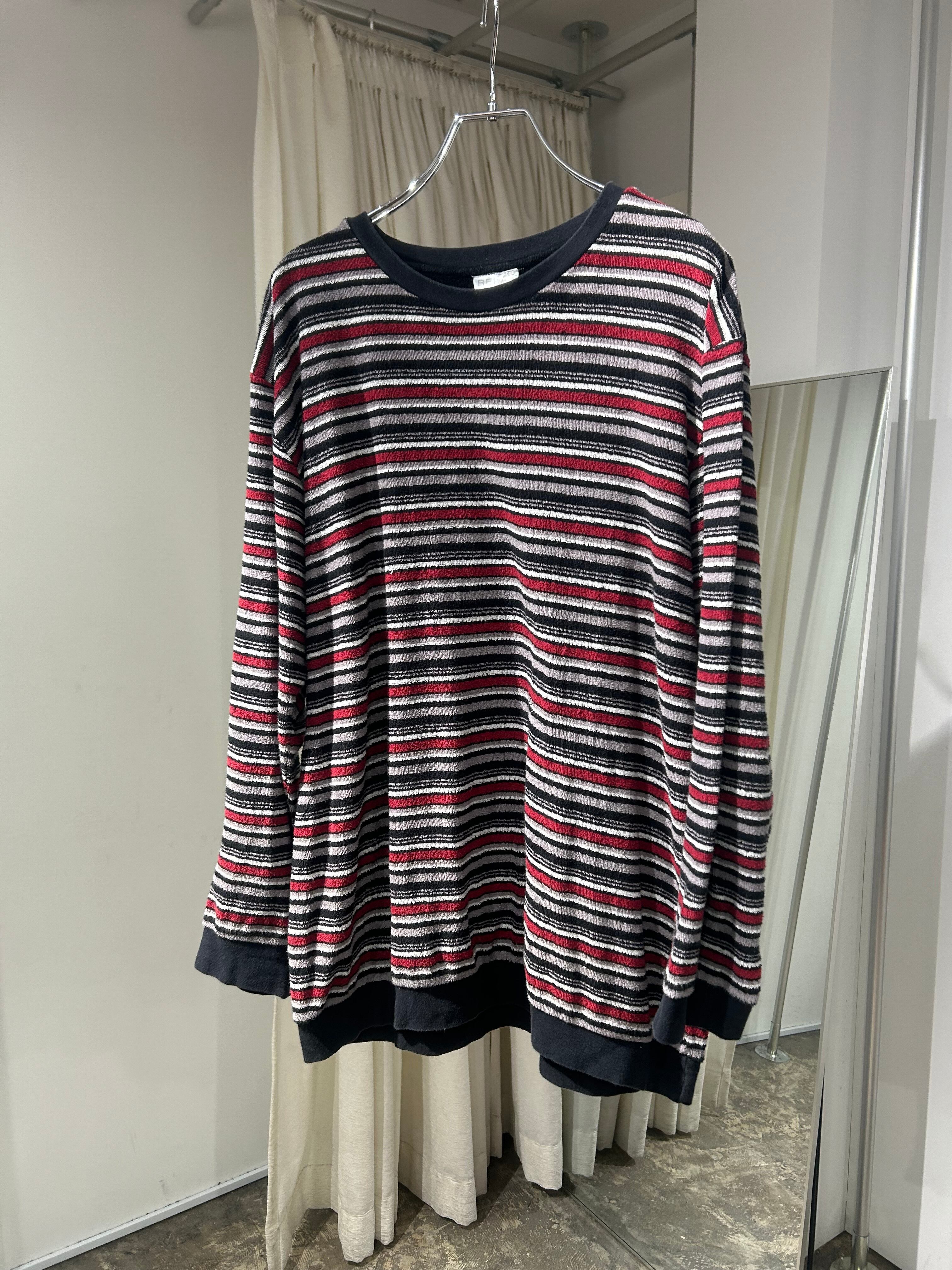 細かいピッチのマルチボーダーに生地がパイル。どこかスケートやサーフのノリを感じます。インナーにして袖だけ出すとかも可愛いと思います。