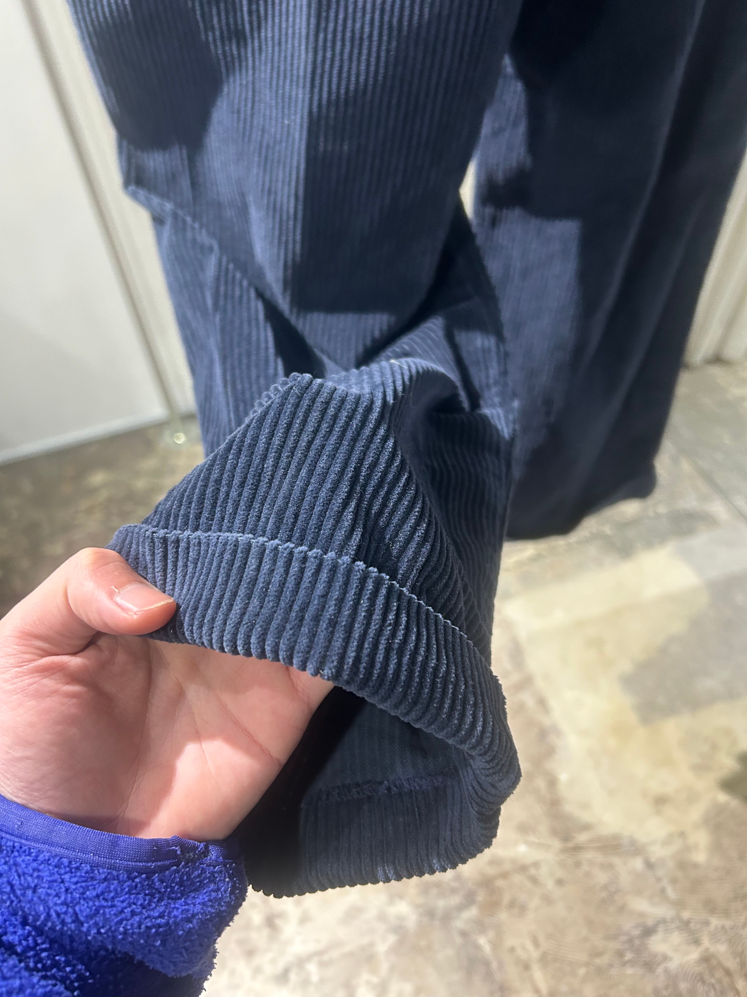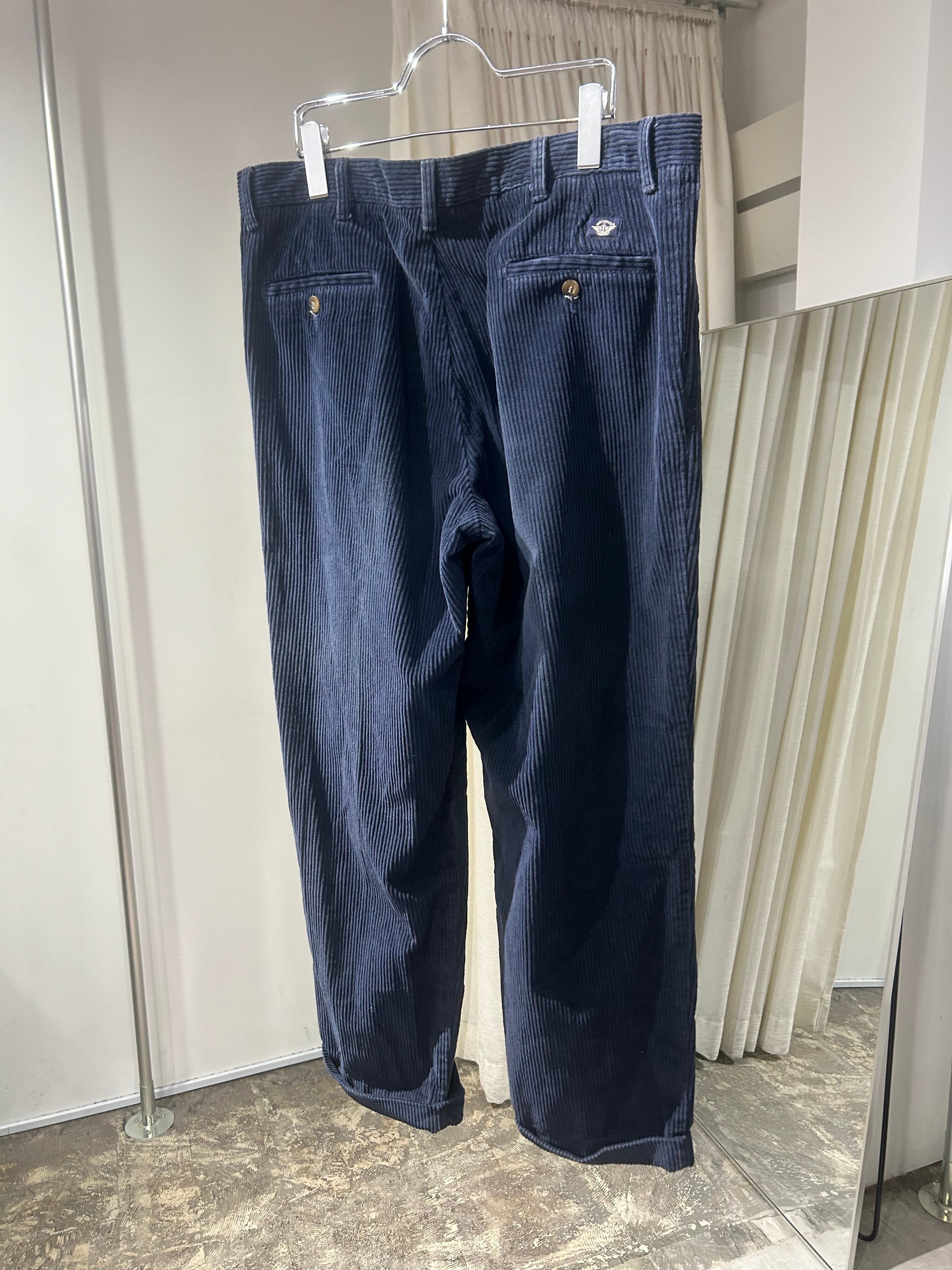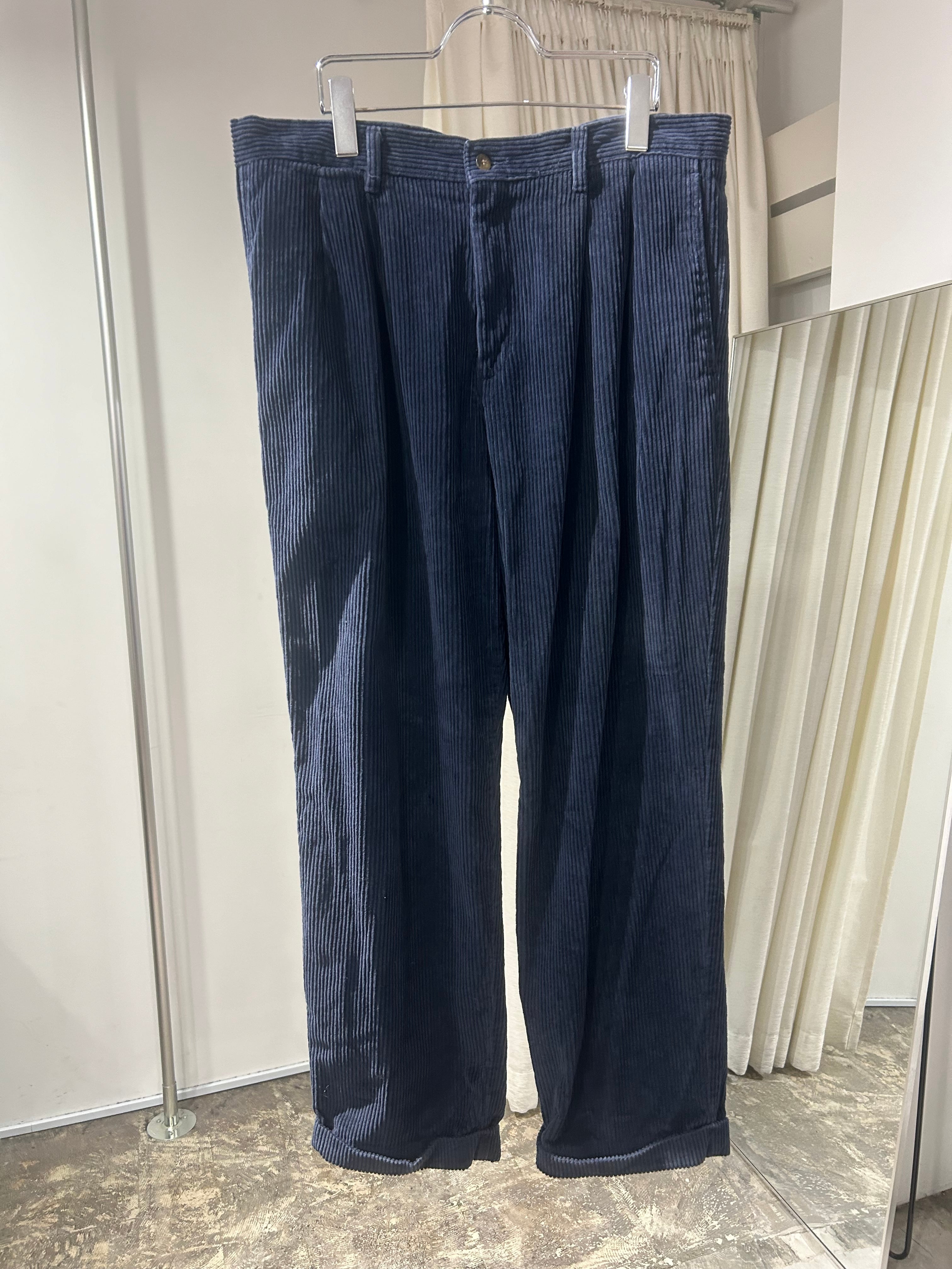 ワイドなシルエットにセミテーパード、ツータック、太畝のコーデュロイ素材が特徴です。裾はダブル仕様。