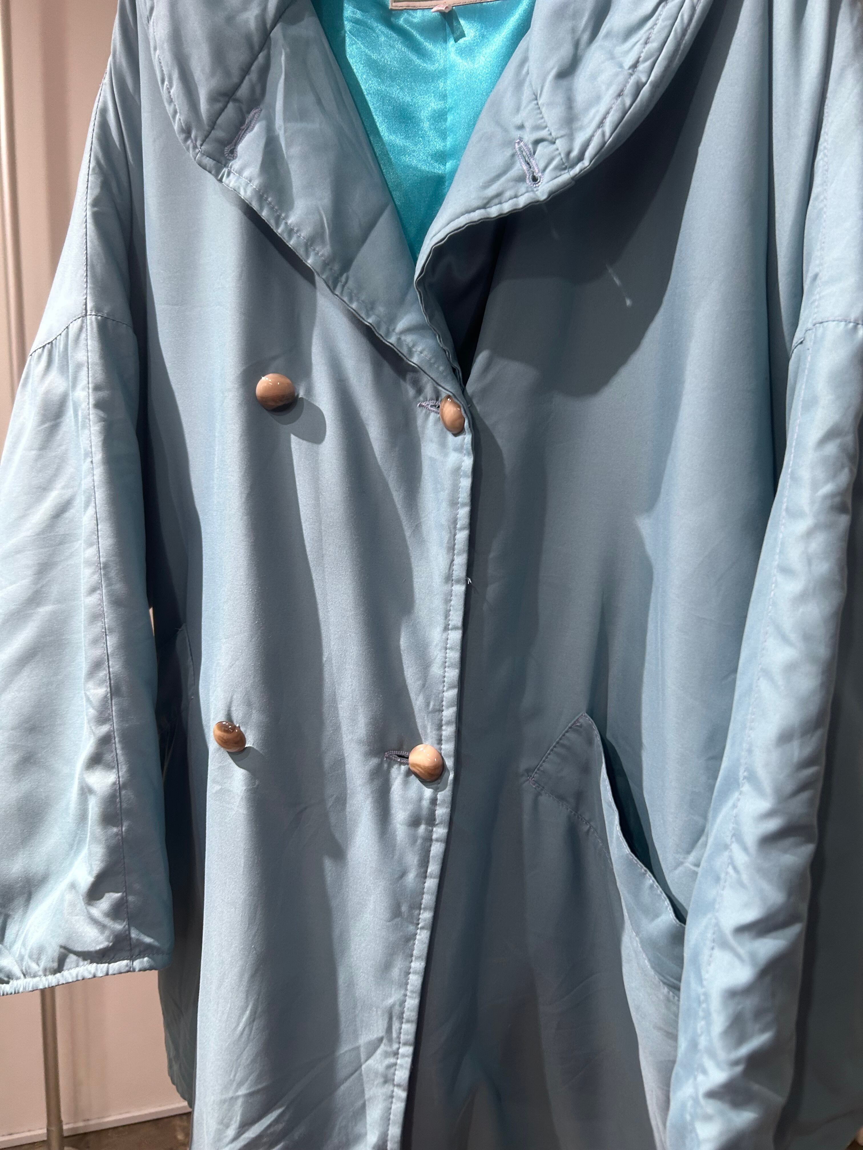 綺麗な水色カラーのショールカラーコート。